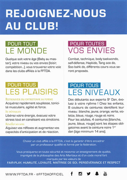 Le club du Chesnay, est agréé par la Fédération Française de Taekwondo. Le club est partenaire de la ville du Chesnay, gage de sérieux et d'implication dans le domaine de la jeunesse, des sports et de la vie associative.